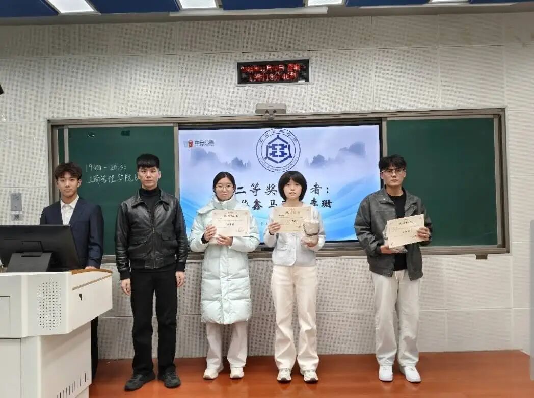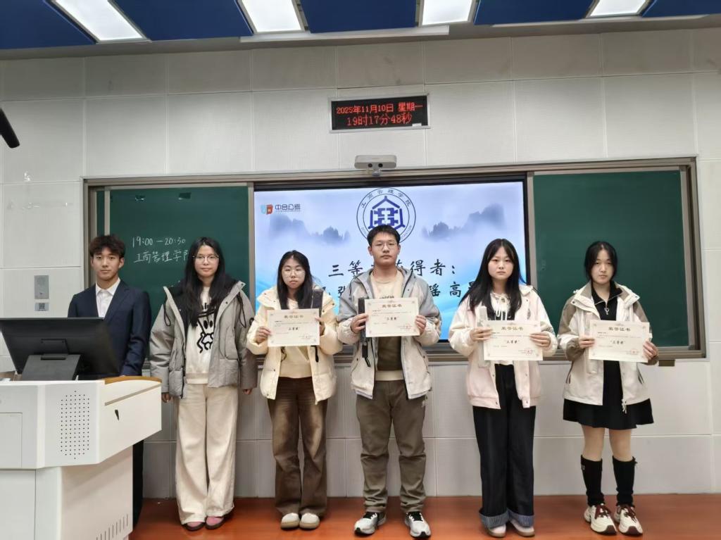 公务员模拟大赛决赛获奖名单揭晓,同学们依次登台领奖,由团委书记王晓东、中合公考赞助商郝亚雄代理及学生会执行主席宋泓霏依次为获奖学子颁发荣誉证书与奖品,对他们在赛事中展现的扎实知识储备和清晰答题逻辑给予高度认可。