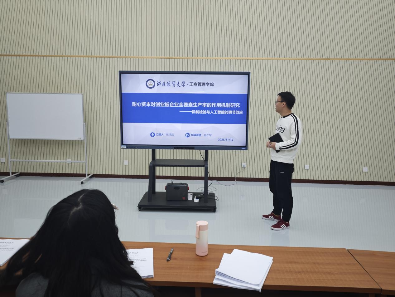 汇报人张泽凯以“耐心资本对创业板企业全要素生产率的作用机制研究:机制检验与人工智能的调节作用”为题,以创业板企业为研究样本,从供应链韧性视角考察了耐心资本对创业板企业全要素生产率的影响,并检验了人工智能在二者之间发挥的正向促进作用。为创业板企业引入耐心资本、优化供应链管理、增强韧性、提升全要素生产率提供经验参考,助力企业在复杂多变的市场中稳健发展、实现可持续增长。