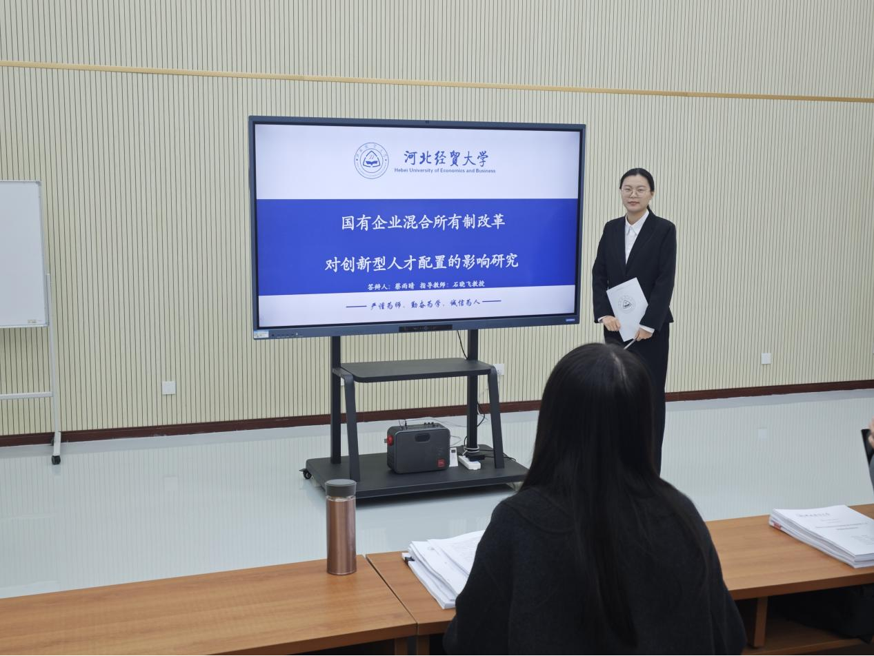 汇报人蔡雨晴以“国有企业混合所有制改革对创新型人才配置的影响研究”为题,从研究背景、研究假设、研究设计、实证结果、结论与启示五个部分展开汇报。以国有企业为研究样本,基于高阶梯队理论和资源基础理论,考察了国有企业混合所有制改革对创新型人才配置的影响及内在作用机制,为国有企业优化人力资本结构提供有益借鉴。