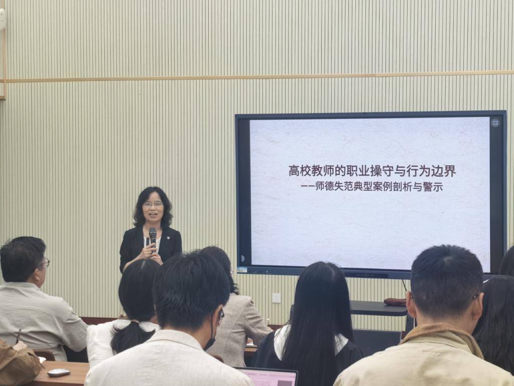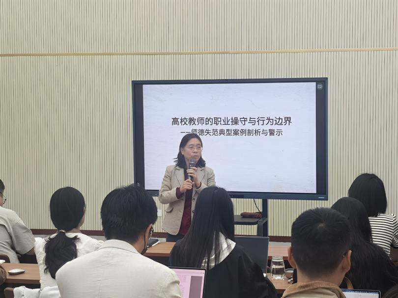田教授围绕高校教师的职业使命与操守要求,从学术诚信、师生关系、公共言论、职业行为等多个维度深入分析了近年来高校中发生的师德失范典型案例,以此强化教师底线思维,明晰教学科研中的行为准则。她指出,高校教师不仅是知识的传播者,更是学生品格养成的重要引导者,必须时刻以《新时代高校教师职业行为十项准则》为镜,坚守职业底线,明确行为边界。随后,田韶华教授结合实际案例就日常教学科研中如何防范师德风险、处理师生关系等问题进行了阐述,她强调,教师应自觉接受监督,强化责任意识,严格以高校教师“五维道德准则”,即坚守为人品德、恪守业务道德、践行育人道德、严守学术道德、遵守公共道德自我约束,切实做到以德立身、以德立学、以德施教。