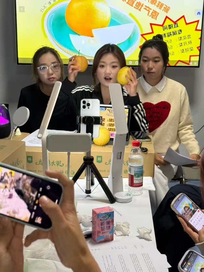 直播伊始,主播们依据专业脚本有序推进,通过播放提前录制的梨园短片,将柳荫街退伍老兵的种梨故事与梨果生长环境生动呈现,迅速拉近了与观众的距离。随后,镜头聚焦直播间内整齐摆放的雪花梨、秋月梨与皇冠梨,主播们手持梨果逐一展示,从果皮色泽、果肉质感至口感差异,细致解读每种梨的特色——雪花梨饱满多汁宜炖煮,秋月梨皮薄核甜够清脆,皇冠梨果香浓郁耐储存,专业又不失通俗的讲解,有效提升了网友的参与兴趣。