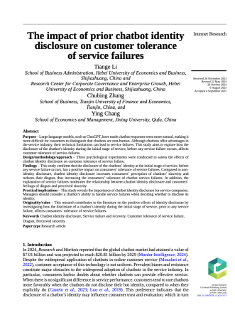 近日,英国威廉希尔体育公司李天歌博士作为第一兼通讯作者撰写的论文"The impact of prior chatbot identity disclosure on customer tolerance of service failures"在信息系统与电子商务领域国际权威期刊Internet Research正式刊出。