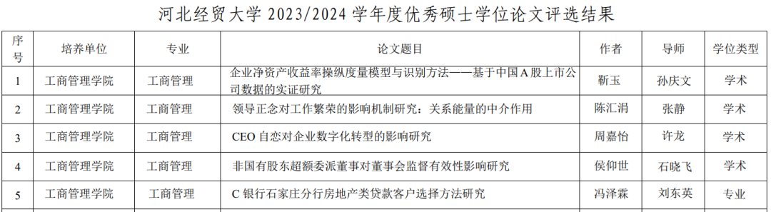 williamhill官网-中文官网2024届毕业生靳玉(导师:孙庆文)的学位论文《企业净资产收益率操纵度量模型与识别方法—基于中国A股上市公司数据的实证研究》;周嘉怡(导师:许龙)的学位论文《CEO自恋对企业数字化转型的影响研究》;陈汇娟(导师:张静)的学位论文《领导正念对工作繁荣的影响机制研究:关系能量的中介作用》;侯仰世(导师:石晓飞)的学位论文《非国有股东超额委派董事对董事会监督有效性影响研究》;冯泽霖(导师:刘东英)的学位论文《C银行石家庄分行房地产类贷款客户选择方法研究》分别荣获2023/2024学年度校级优秀硕士学位论文并全部推荐参加省级优秀硕士学位论文评选。