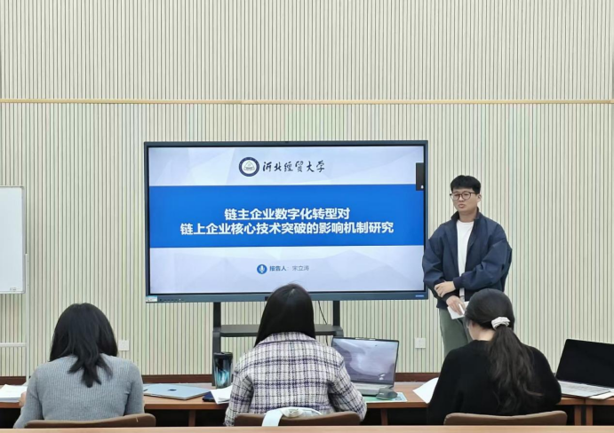 汇报人宋立涛以“链主企业数字化转型对链上企业核心技术突破的影响机制研究”为题,从研究背景、研究假设、研究设计、实证分析、结论与启示、创新与不足六个部分展开汇报。以2011至2023年中国A股上市公司及其前五大客户与供应商企业作为研究样本,从直接效应、中介机制、调节路径、异质性维度考查了链主企业数字化转型对链上企业关键核心技术突破的影响。