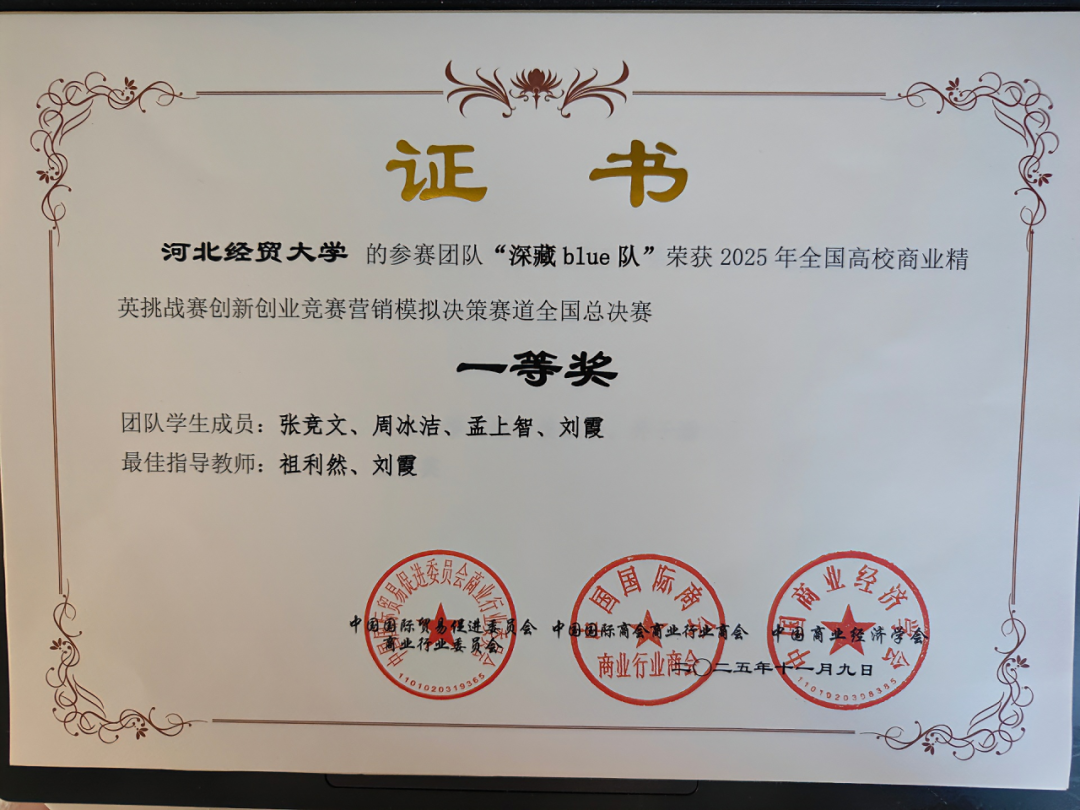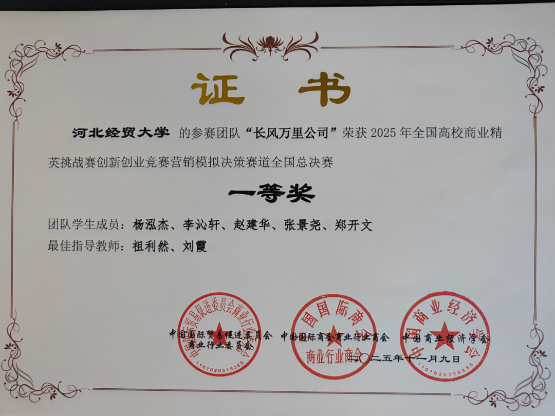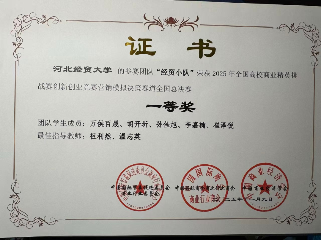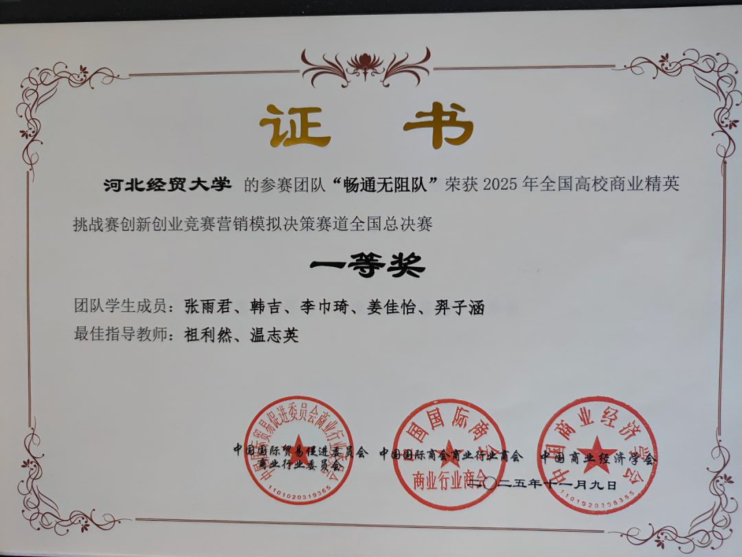 2025年11月29日,由中国国际贸易促进会、中国商业经济学会主办的全国高校商业精英挑战赛营销模拟决策精英赛结束。williamhill官网-中文官网学生在祖利然、温志英、刘霞老师的带领下,经过知识赛、校赛、全国预选赛和决赛的激烈角逐,最终进入决赛的四个团队均获得全国一等奖。
