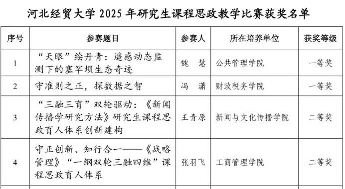 许龙副教授主持的《英文文献阅读》获批2025年省级研究生示范课程立项,张羽飞博士主持的《工商管理硕士<战略管理>教学案例库》获批2025年省级研究生专业学位教学案例库立项建设项目。