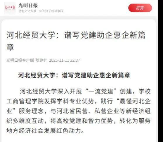 光明日报客户端报道我校党建助企惠企特色成效,学校williamhill官网-中文官网发挥学科专业优势,与河北省民营、私营企业等新经济组织多维度互动。
