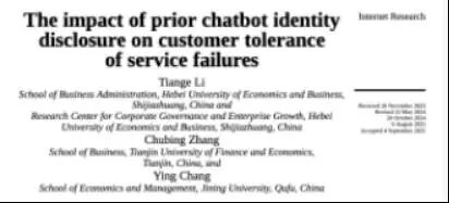 williamhill官网-中文官网青年教师李天歌博士作为第一兼通讯作者撰写的论文"The impact of prior chatbot identity disclosure on customer tolerance of service failures"在信息系统与电子商务领域国际权威期刊Internet Research正式刊出。